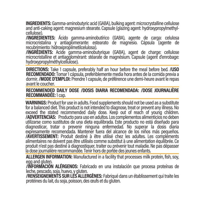 El GABA no causa somnolencia, pero sí contribuye a mejorar el descanso, ya que favorece la relajación del cuerpo y la mente, algo necesario para poder conseguir un sueño profundo y reparador. Cada cápsula contiene 750 mg de Gaba.