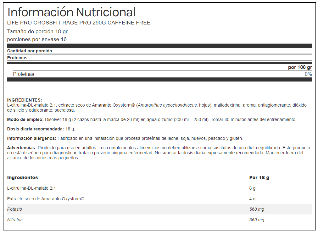 Cada toma de Life Pro Rage aporta 8 gramos de citrulina malato en proporción 2:1 y 4 gramos de extracto seco de amaranto. No contiene cafeína ni ningún otro compuesto con propiedades estimulantes.
